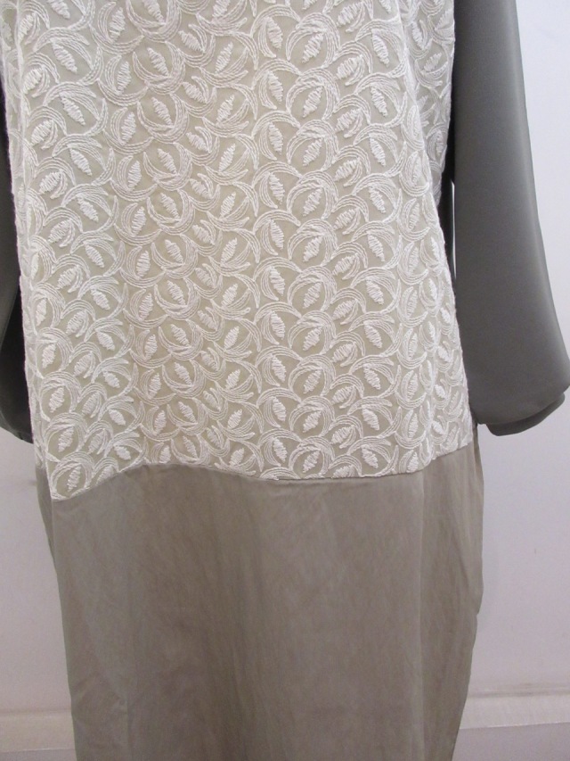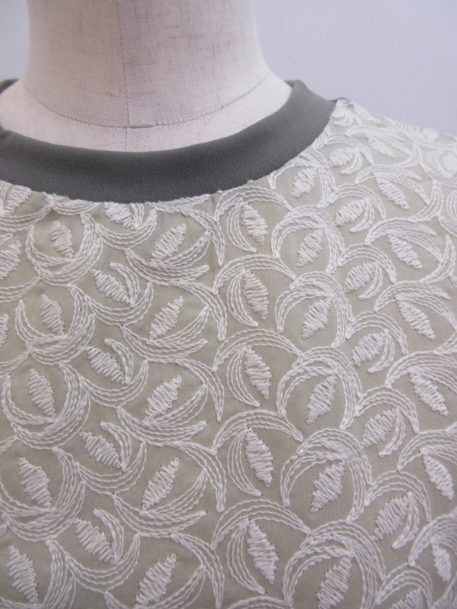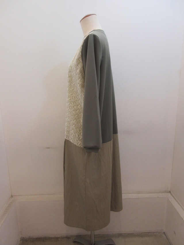 前身頃にボタニカル柄の刺繍が施されたワンピース。 一枚仕立て、両サイドポケット付き、無地の素材は伸縮性のあるライトダンボールニット。