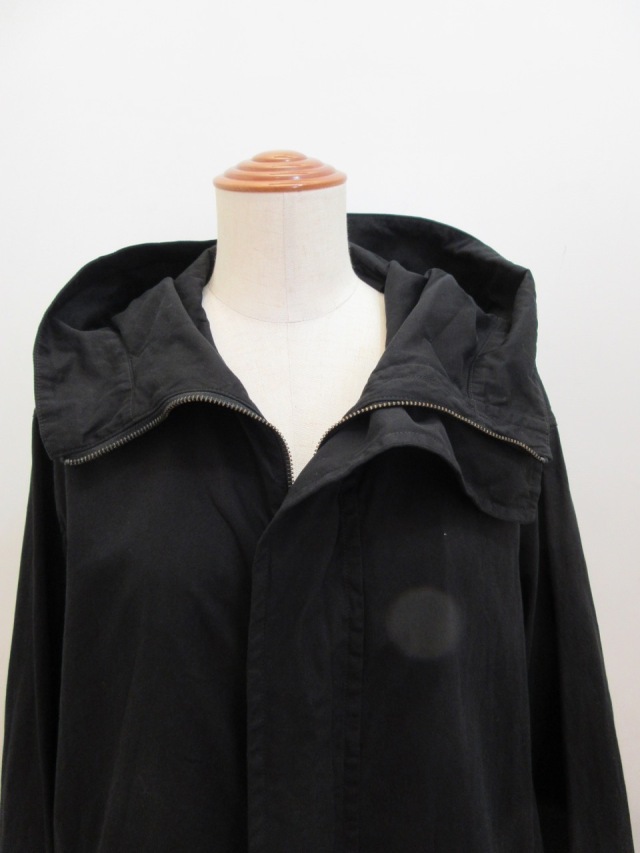 裏地なし高密度のあるメンツイル素材を使ったフード付き前ファスナーコート。