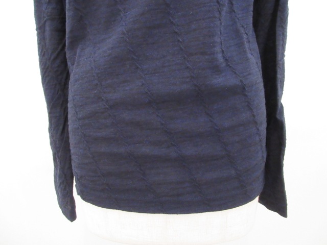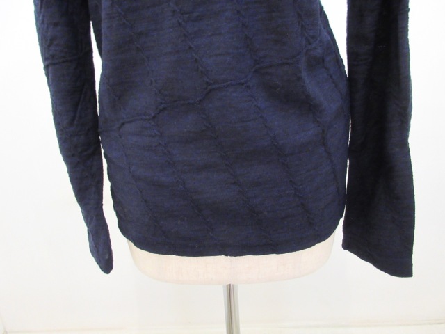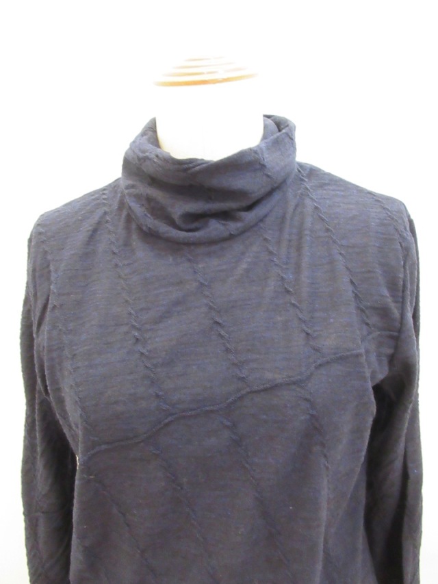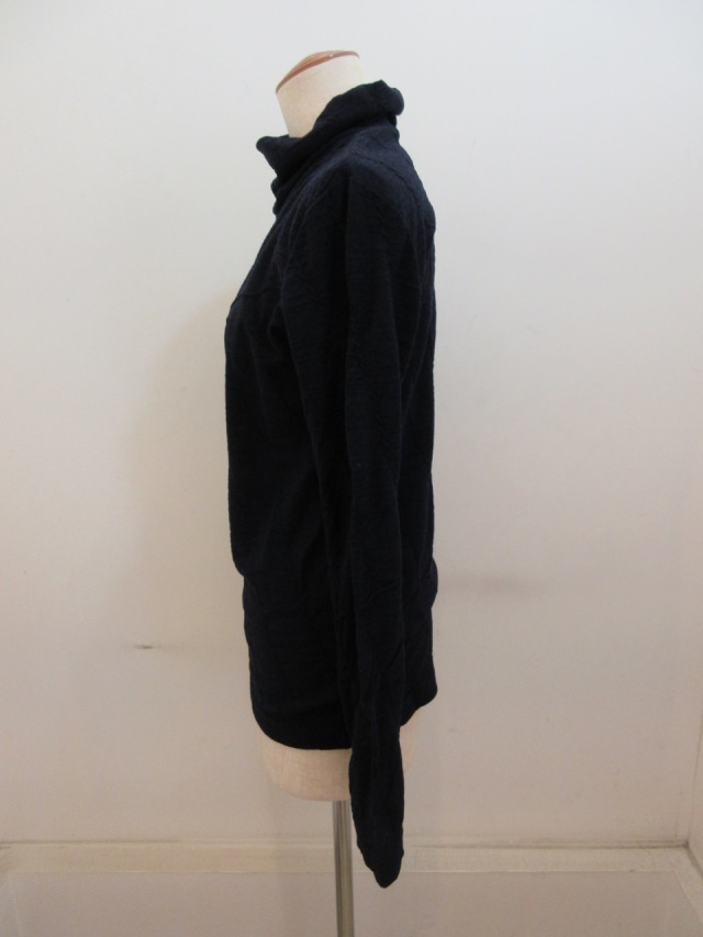 カテゴリー:ハイネックTシャツ サイズ:2 カラー: ネイビー 素材:毛100% 日本製 アイテムサイズ 2:着丈63cm/肩幅39cm/身幅88cm/袖丈61cm