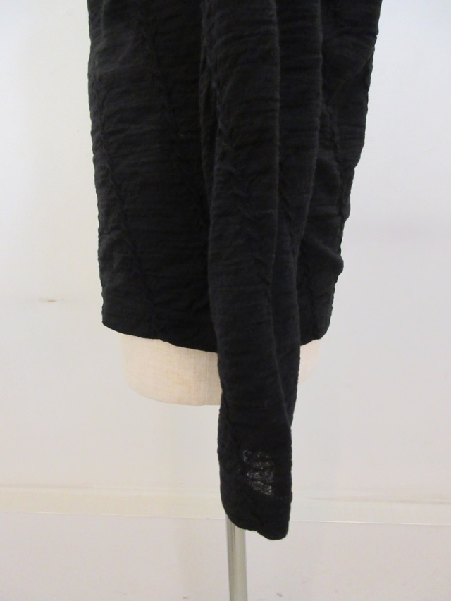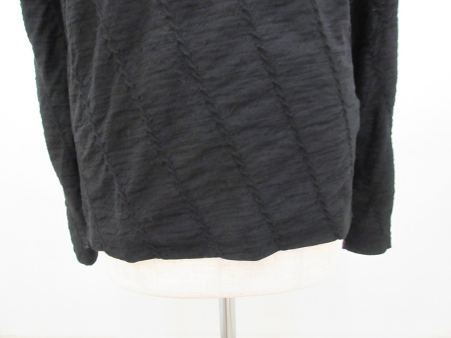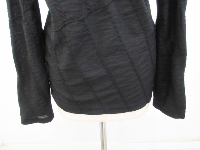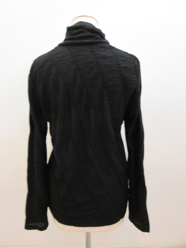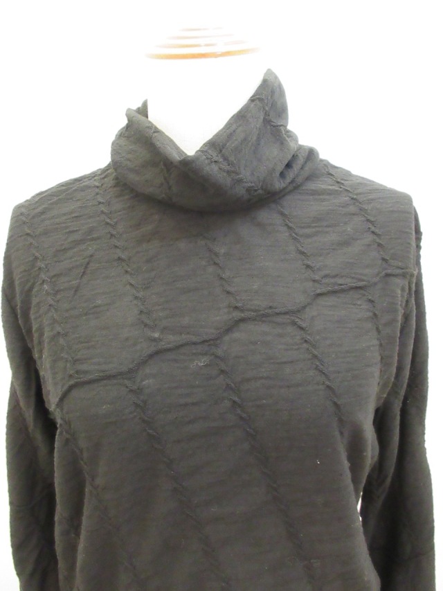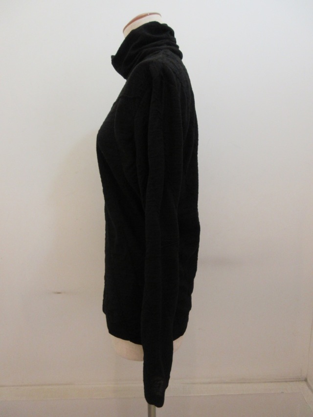 カテゴリー:ハイネックTシャツ サイズ:2 カラー: ブラック 素材:毛100% 日本製 アイテムサイズ 2:着丈63cm/肩幅39cm/身幅88cm/袖丈61cm